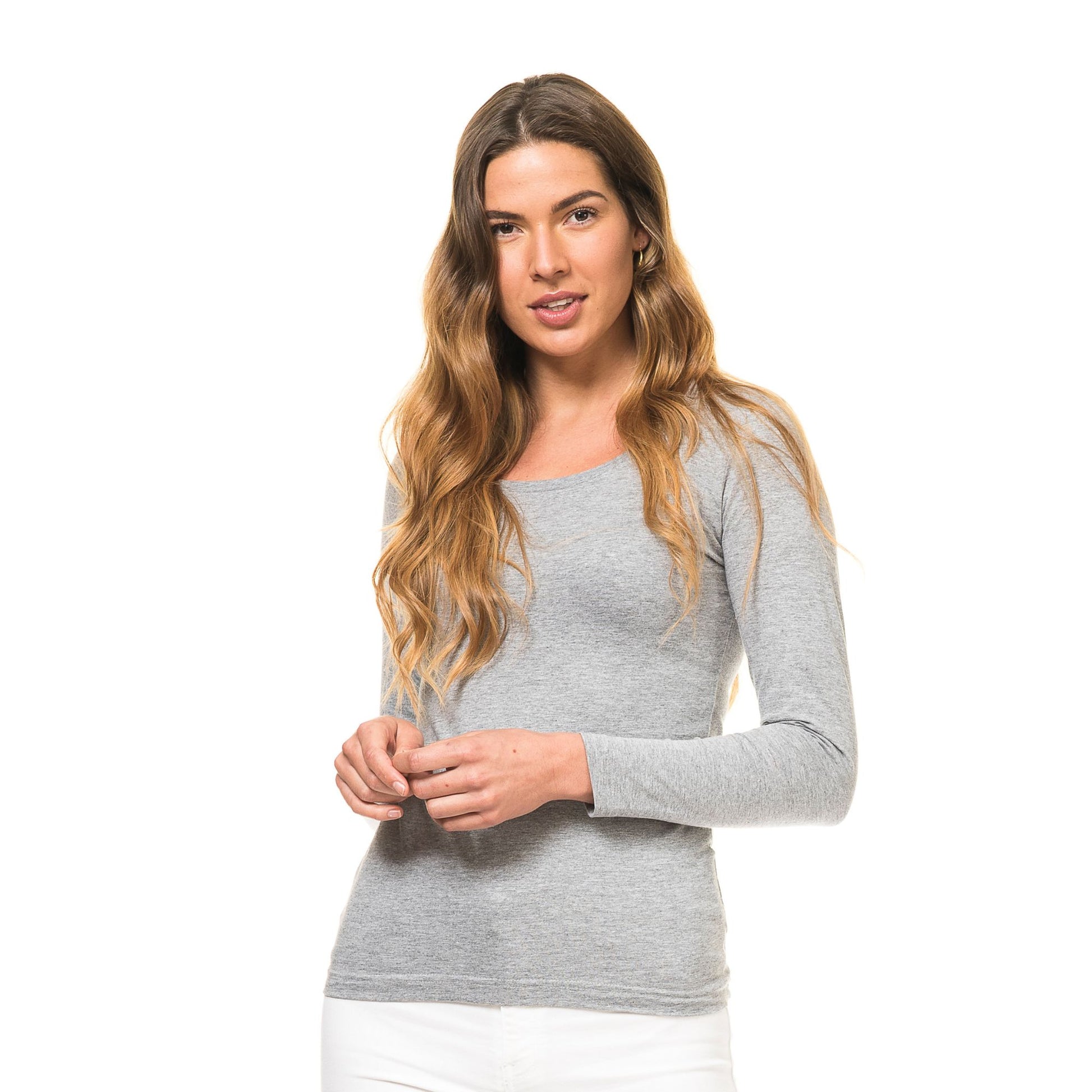 Naisten pitkähihainen, tiukasti istuva T-paita. Pyöreä pääntie kapealla kauluksella. Sivusaumat ja kaksoistikkaukset viimeistelevät ilmeen.